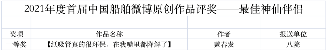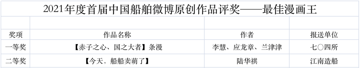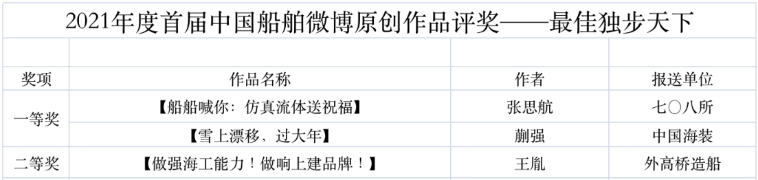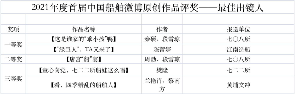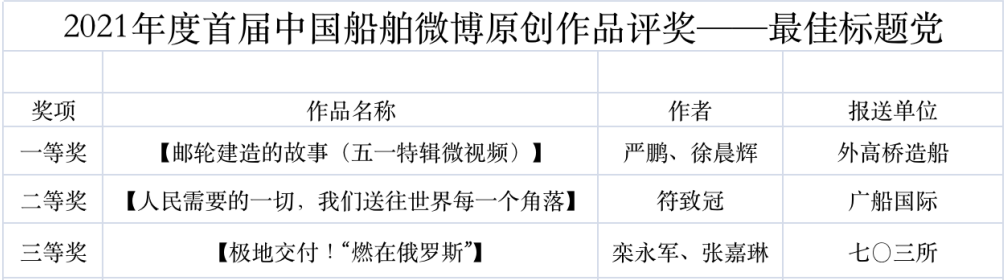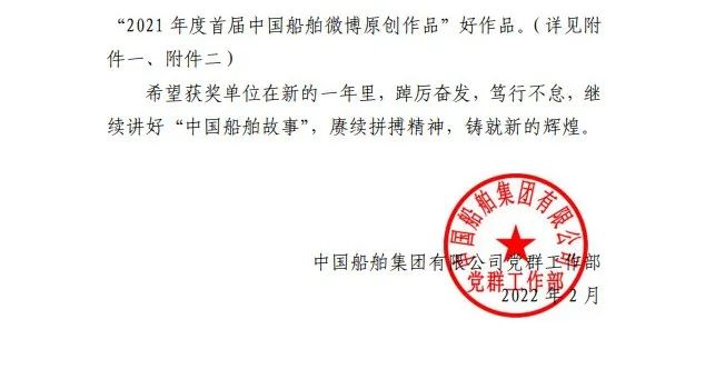 為鼓勵(lì)更多成員單位積極加入到中國船舶集團(tuán)新媒體平臺(tái)的宣傳中來,在集團(tuán)公司黨群工作部的指導(dǎo)下,中國船舶報(bào)社從不同維度,對(duì)2021年度各單位支持“中國船舶”微信的力度進(jìn)行了梳理統(tǒng)計(jì),并利用微博政務(wù)的全國專家?guī)煸u(píng)審資源,對(duì)2021年度“中國船舶”微博原創(chuàng)作品進(jìn)行了專業(yè)評(píng)審,評(píng)選結(jié)果公布如下: