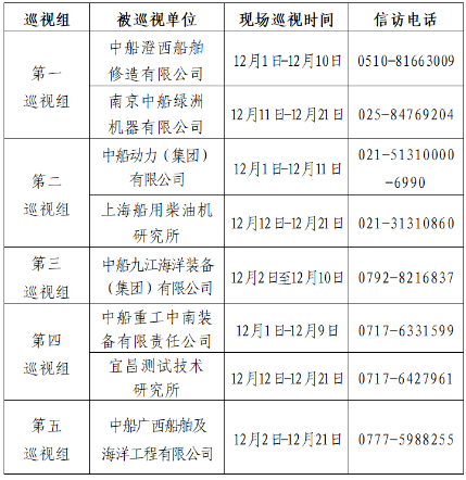 根據中國船舶集團黨組2022年第二輪巡視工作部署,截至2022年12月2日,中國船舶集團黨組5個巡視組已進駐中船澄西船舶修造有限公司、中船動力(集團)有限公司、中船九江海洋裝備(集團)有限公司、中船重工中南裝備有限責任公司、中船廣西船舶及海洋工程有限公司等單位,開展為期20天左右的巡視“回頭看”。巡視期間,巡視組設置專門值班電話(具體如下表),同時在巡視組工作現場設置聯系信箱,廣大干部職工可以反映情況。