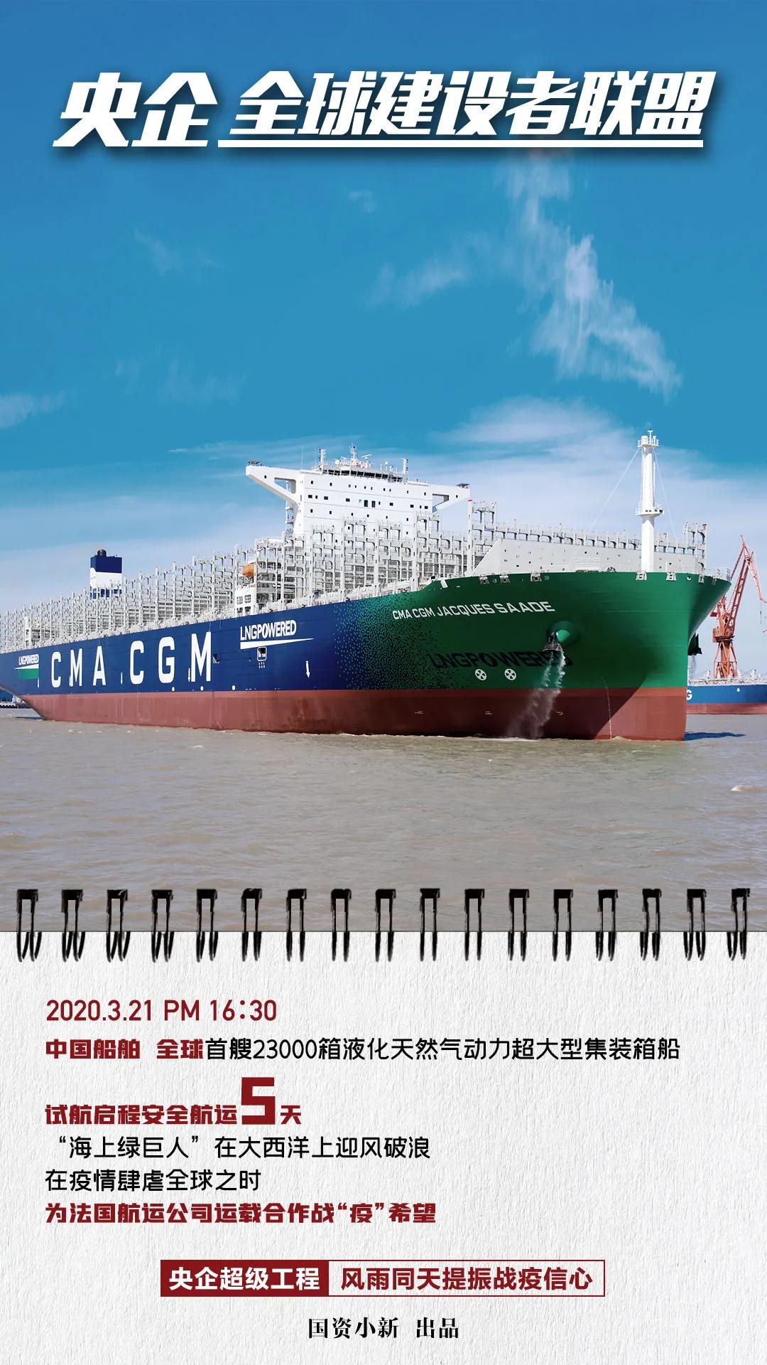 ????今天,國資小新發(fā)布圖文消息《央企全球建設(shè)者聯(lián)盟:風(fēng)雨同天提振國際合作戰(zhàn)疫信心!》。開篇提到中國船舶集團(tuán)所屬滬東中華建造的全球首艘23000箱液化天然氣(LNG)動力集裝箱船開啟常規(guī)試航之旅,在疫情肆虐全球之時,為法國航運(yùn)公司運(yùn)載合作戰(zhàn)“疫”希望。